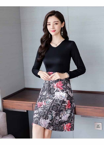 Đầm body in hoa cổ và chân váy